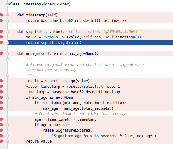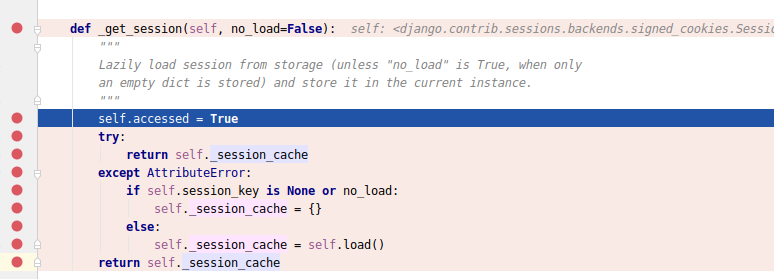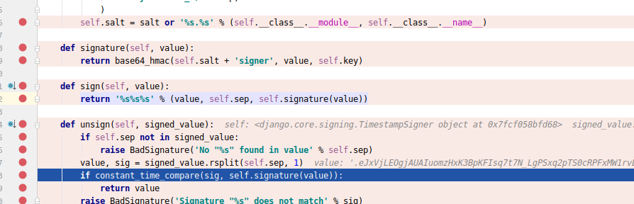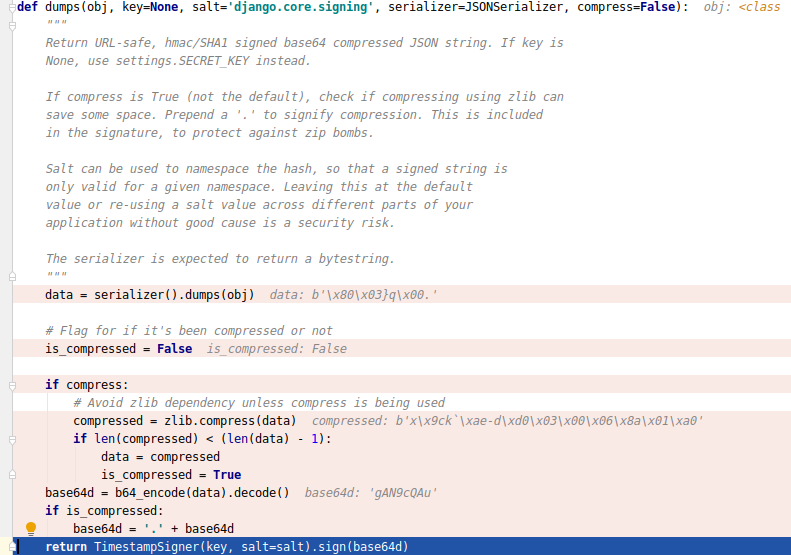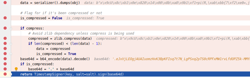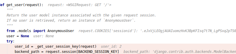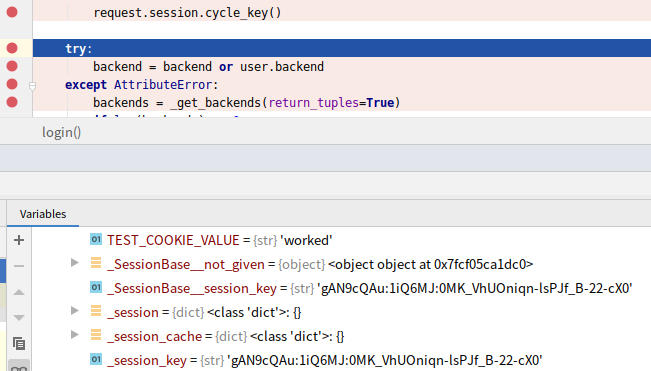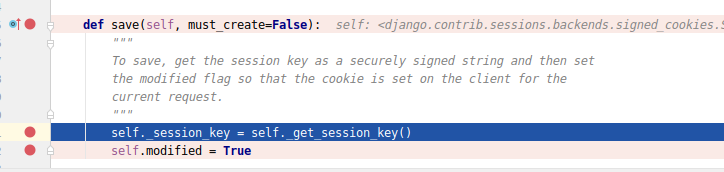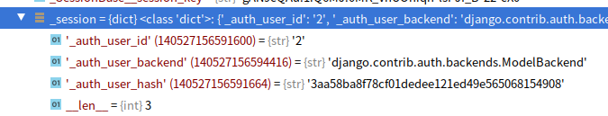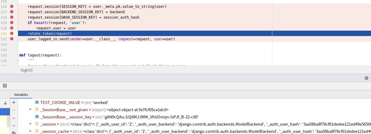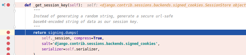本题刚好使用了django.contrib.sessions.backends.signed_cookies和core.serializer.PickleSerializer,也就是官方文档叙述的情况,这时候思路就比较清晰了,然后我们来看看django基于cookie的session是如果生成的,由于P神源码没有直接启用session的地方,所以我们从auth_login那里开始下断点(校验登陆信息才会使用session):