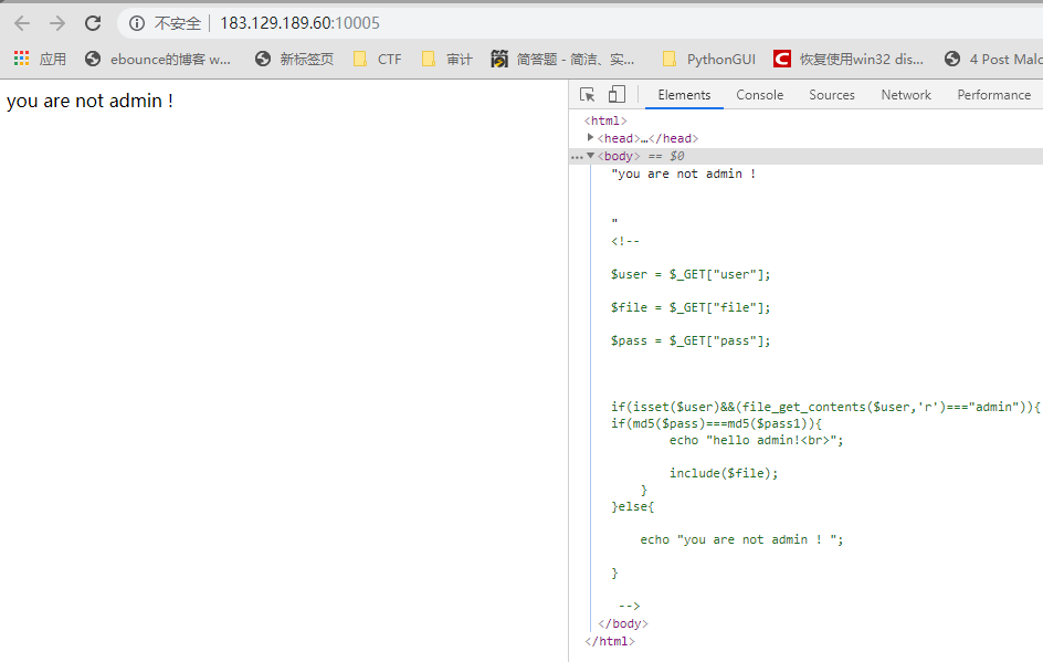点开环境发现,这里提示我们不是admin,然后F12查看源码,发现把php源码写在html注释里面了:
