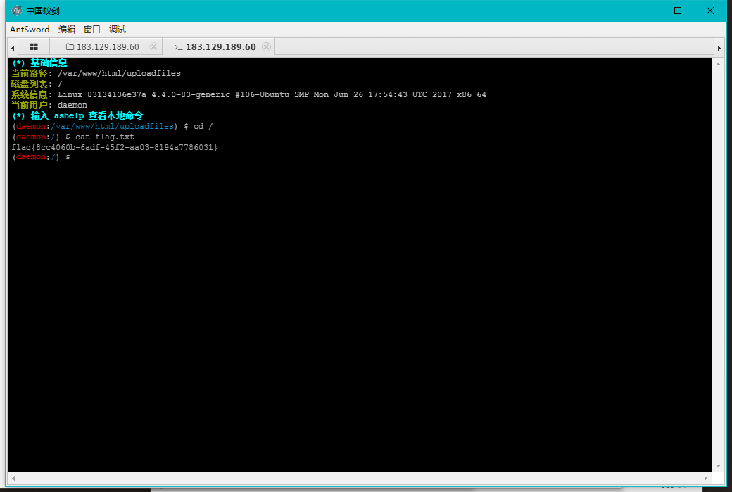 用蚁剑发现可以连接,到处翻翻在根目录下得到flag:
