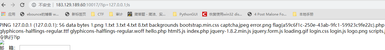 猜测源码为system("ping".$_GET['id']);,要能够读取flag,可以使用linux下的多命令执行一个是&&,还有一个是;,这里我是用的是;,先用ls看看当前目录下有哪些内容吧,然后没想到直接就出flag了