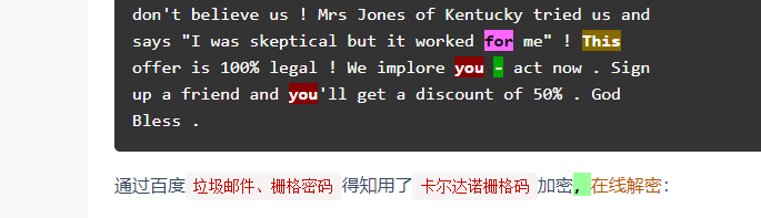 然后根据提示的spam,加上直接搜索解码原文,找到同类型的题,得到一个叫做 卡尔达诺栅格码 的东西,找到在线加密,得到flag