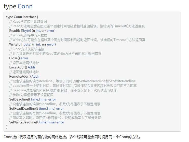 Conn实际上是一个接口,里面包含了io.Read和io.Write,而io包中这两个接口,实际上包装了基本的Read和write方法,因此我们对于一个TCP连接只需要传入一个Conn接口即可。