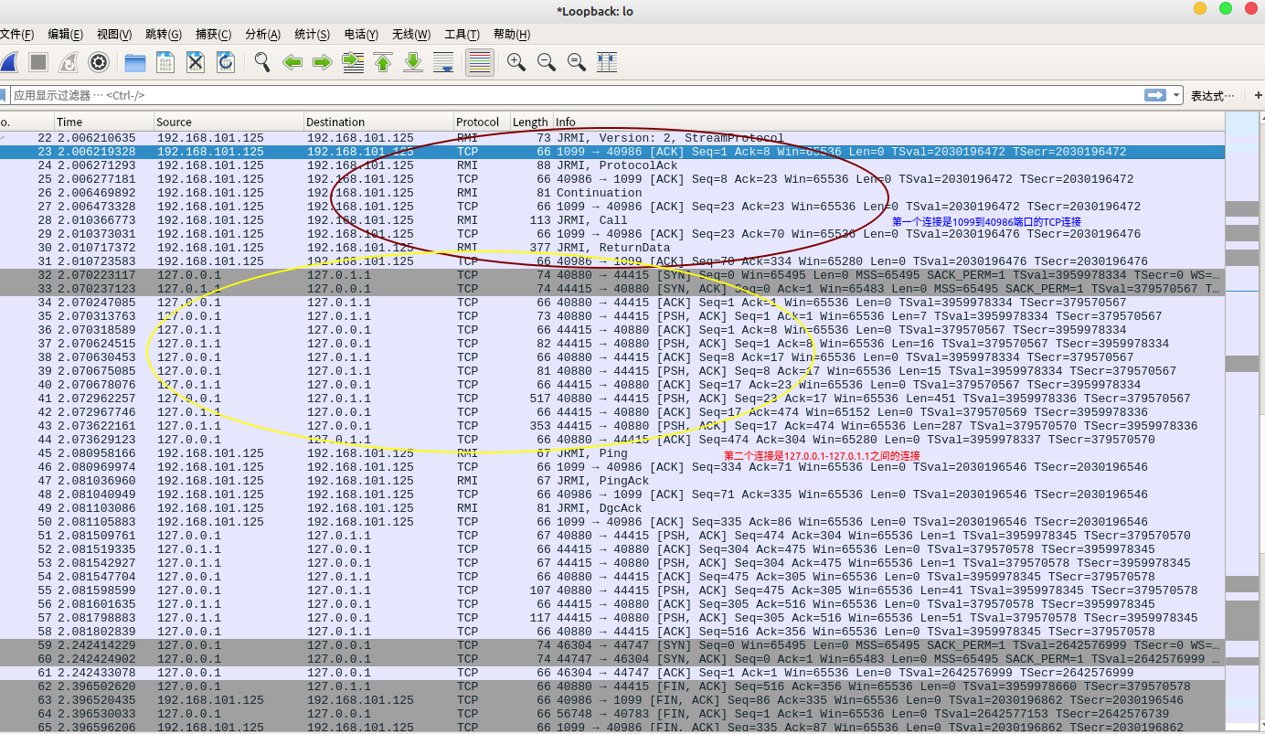 我们可以看出在一次RMI通信过程中,共进行了两次TCP连接,一次是端口1099-40986端口的通信,还有一次是两个不同的ip地址之间的通信为127.0.0.1-127.0.1.1