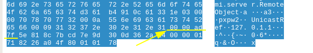 前面的就是ip地址127.0.1.1了,也就是我们客户端的地址,实际上这段数据包从开头的\xac\xed就是Java序列化的数据了,其中ip和地址也只是相应的对象而已。