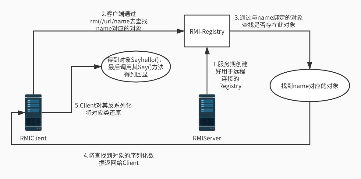 首先客户端连接服务器创建的Registry,连接完成以后根据RMI当时定义好的Name去寻找,找到了对应的Name="say"对象之后,返回一个序列化该对象的数据包,根据序列化的内容,建立TCP连接之后发送到客户端127.0.1.1,然后客户端反序列化这个对象,还原对应的类,从而我们才能在代码中调用Say()方法,最后获得对应内容。图示为: