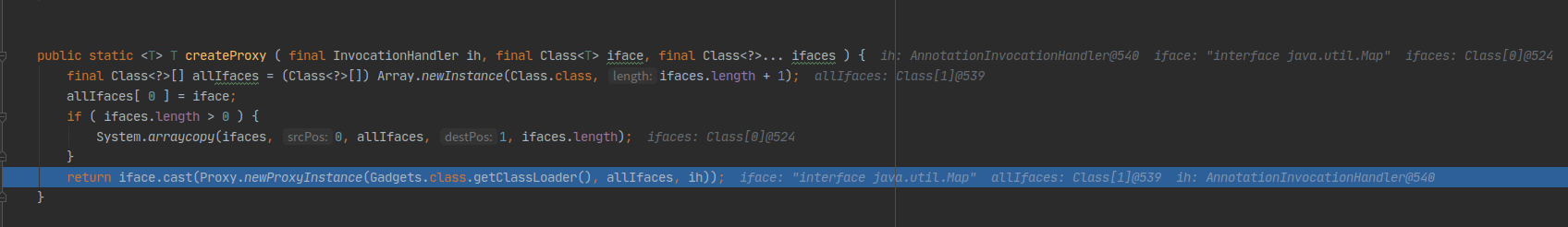 return iface.cast(Proxy.newProxyInstance(Gadgets.class.getClassLoader(), allIfaces, ih));
