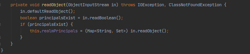 这里涉及到了两个类,从类名来看下面的Map应该是类似于将用户对象,以Map的形式存入,因此我们看看SimplePrincipalCollection,这里最终找到了readObject方法,也就是反序列化的入口了。