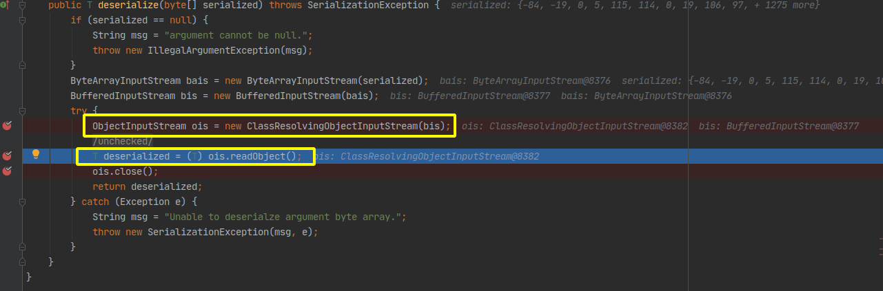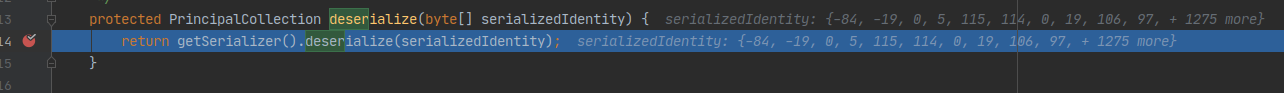 }这里存在将对象转化成字节序列的操作,也就是序列化和反序列化对象的操作,而我们的Principals对象里面的反序列化方法readObject使用的默认的defaultReadObject()基本啥都能读,所以这里只需要传入一个构造好的恶意反序列化对象,Principals就我帮我们触发反序列化漏洞了,最后就来看看AbstractRememberMeManager.deserialize方法吧