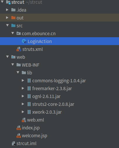 P神的环境里面只有一个war包,但作为漏洞分析我们肯定少不了调试的,百度了一下,基本没有给出一个war包直接导出项目的办法,所以我们将war包中的源码解压出来,在idea重新创建一个Struct2项目,将源码搬过去。当然.class是不能直接搬过去的,因为是那个Java编译好的代码,所以我们使用idea的反编译,将反编译的源码带出即可,然后其他的.xml之类的基本可以粘贴复制了,不过需要注意的是lib包也要带出。