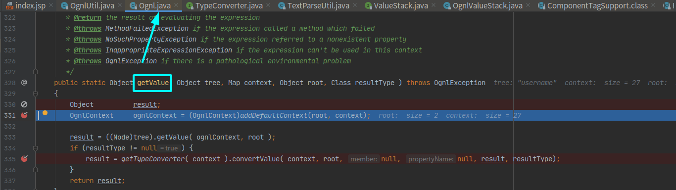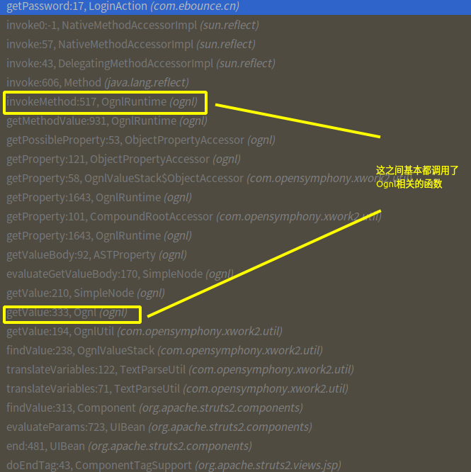 最后通过反射的invoke方法进行返回,具体解析是通过OgnlUtil.getValue进行的,实际上这个类最后调用的是抽象类Ognl中的getValue,具体实现细节就不去纠结了,总之最后调用: