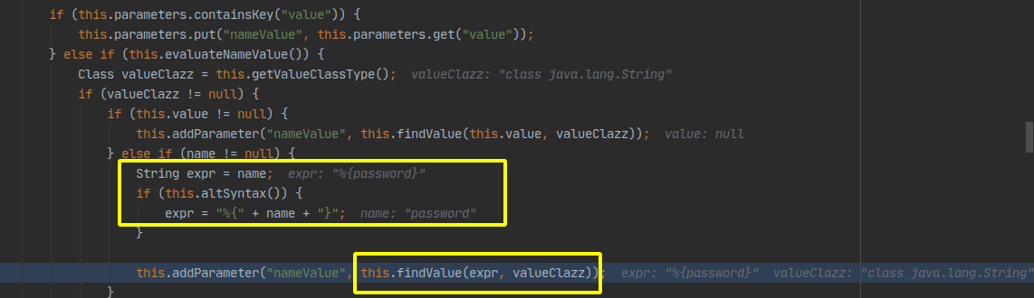 最开始由于我们在jsp中使用了模板渲染,因此头两个函数是解析到了模板语法的闭合,来分析值的问题,从evaluateParams函数开始就是重头戏了,首先evaluateParams会生成Ognl表达式: