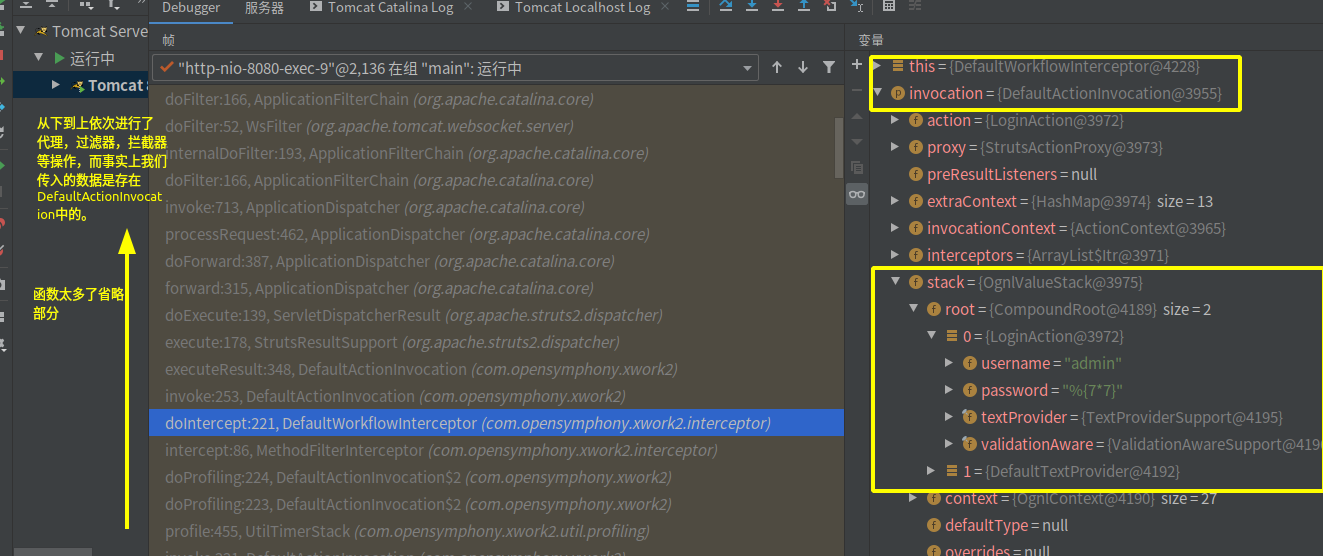 简单来说就是Struct2接受到了页面请求之后,会交给StrcutsActionProxy进行代理,然后这个代理类会分发给DefaultActionInvocation进行具体处理,从函数栈来看是这样的:
