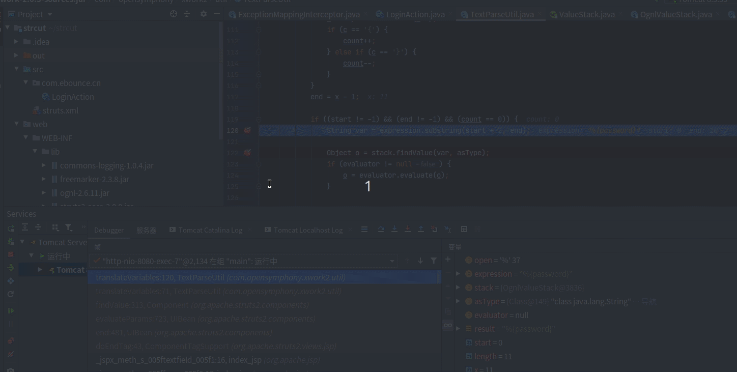 }这里我们注意到了启动了一个死循环,他具体的作用就是解析Ogrl表达式,然后调用Object o = stack.findValue(var, asType);去找到对应的值,还记得我们之前看拦截器对象时候的情况吗?我们传入的值被塞入一个Stack里,因此这里我们会看到通过stack去找值: