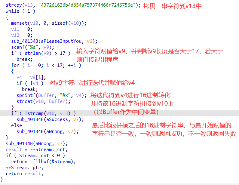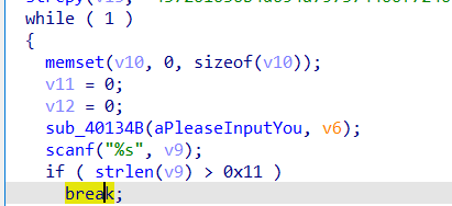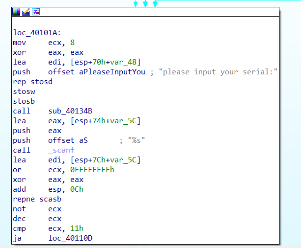 call sub_40134B此步对应了print("please input your serial")操作,实际进入sub_40134B函数体中,是将字符串赋到stout上,这里就不作详细分析了。