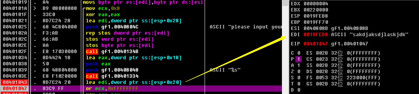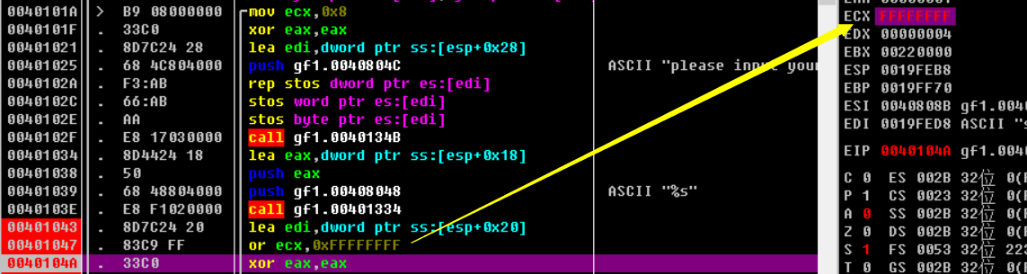 edi中的地址指向我们输入的内容,这里可以判断出scanf函数给输入分配的地址为[esp+0x18],接着ecx按位与0xFFFFFFFF进行了或计算,此时ecx中的内容变为了全1: